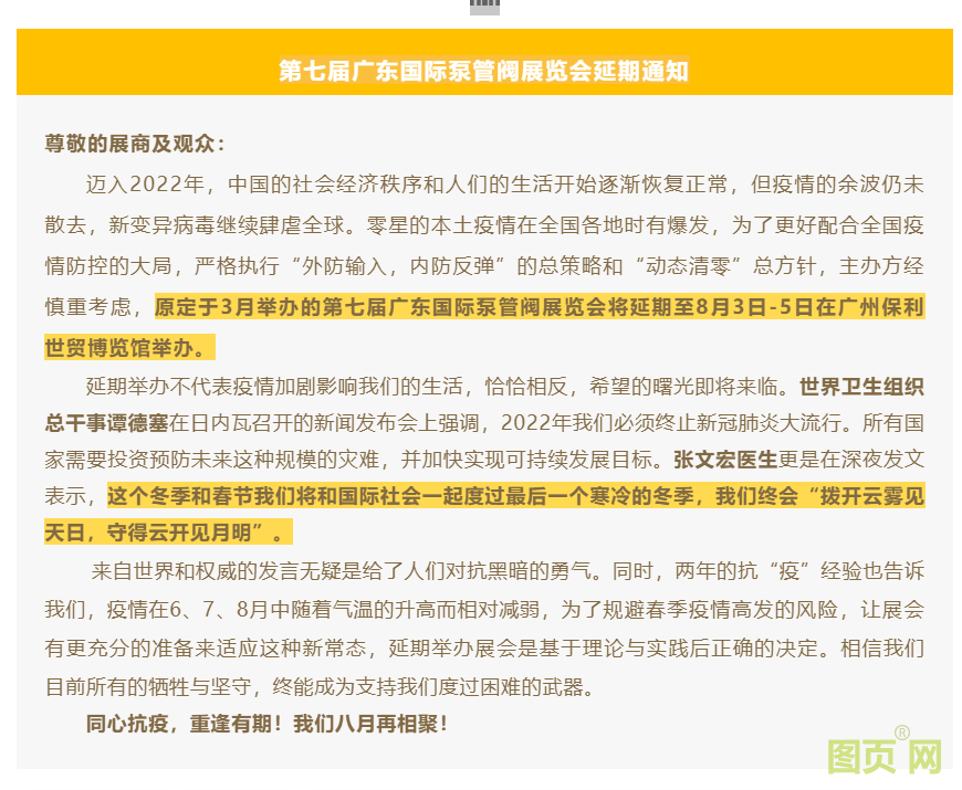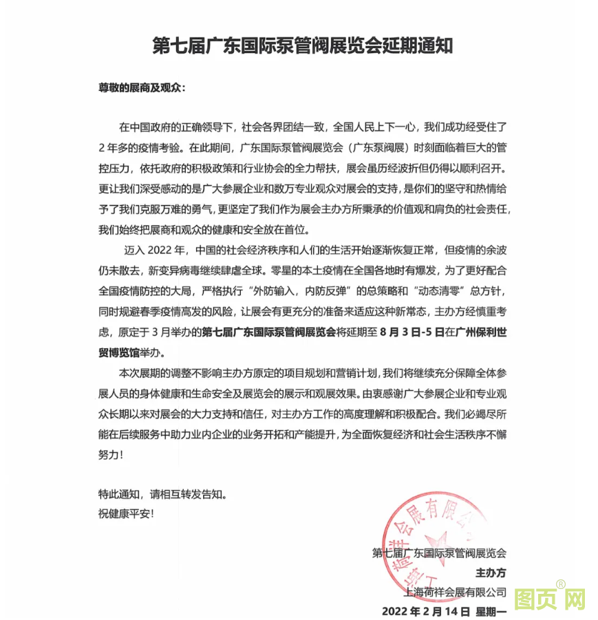 【延期通知】關(guān)于延期舉辦第七屆廣東國(guó)際泵管閥展覽會(huì)的通知