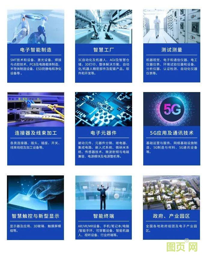九大專業(yè)展區(qū) – 包含電子智能制造、智慧工廠、5G應(yīng)用及通訊技術(shù)、電子元器件、測試測量、智慧觸控與新型顯示、連接器及線束加工、智能終端,政府、產(chǎn)業(yè)園區(qū)展區(qū),涵蓋電子產(chǎn)業(yè)中的主要類別,助力企業(yè) 打造重點(diǎn)領(lǐng)域產(chǎn) 業(yè)鏈競爭優(yōu)勢。