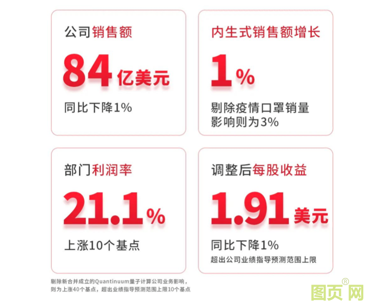 霍尼韋爾近日公布了2022年第一季度業(yè)績(jī)。公司第一季度銷售額為84億美元,同比下降1%,內(nèi)生式銷售額增長(zhǎng)1%,部門利潤(rùn)率上漲10個(gè)基點(diǎn)至21.1%。預(yù)計(jì)2022年全年銷售額將在355億美元到364億美元,高于公司此前354億美元到364億美元預(yù)期。