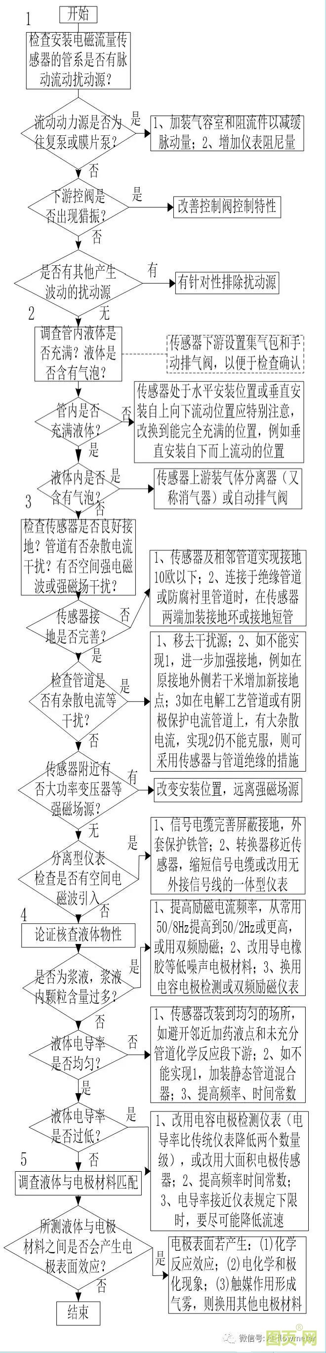 如上圖所示是檢查電磁流量計信號輸出晃動的流程。先按流程全面考慮作初步調(diào)查和判斷,然后再逐項細致檢查和調(diào)試排除故障。