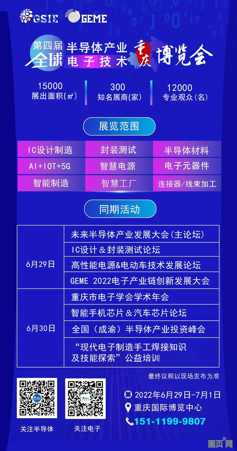 由中國(guó)電子學(xué)會(huì)、中國(guó)汽車工業(yè)協(xié)會(huì)、重慶市經(jīng)濟(jì)和信息化委員會(huì)共同支持,重慶市電子學(xué)會(huì)、四川省電子學(xué)會(huì)、重慶市半導(dǎo)體行業(yè)協(xié)會(huì)、重慶市電源學(xué)會(huì)、重慶市機(jī)器人與智能裝備產(chǎn)業(yè)聯(lián)合會(huì)、重慶市集成電路技術(shù)創(chuàng)新戰(zhàn)略聯(lián)盟、重慶市電子產(chǎn)業(yè)技術(shù)創(chuàng)新戰(zhàn)略聯(lián)盟、重慶市電子電路制造行業(yè)協(xié)會(huì)共同主辦的第四屆全球半導(dǎo)體產(chǎn)業(yè)與電子技術(shù)(重慶)博覽會(huì)將于6月29日-7月1日重慶國(guó)際博覽中心召開