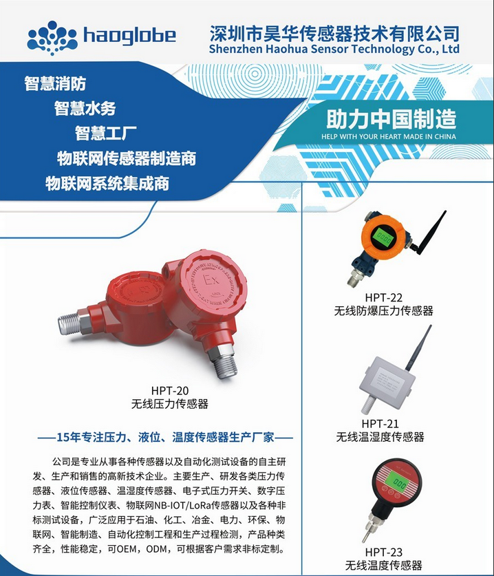 深圳市昊華傳感器技術(shù)有限公司公司于2006年就專業(yè)從事各種傳感器以及自動化測試設(shè)備的自主研發(fā)、生產(chǎn)和銷售,并且獲得了國家高新技術(shù)企業(yè)認(rèn)證。公司主要生產(chǎn)、研發(fā)各類壓力傳感器、液位傳感器、溫濕度傳感器、電子式壓力開關(guān)、數(shù)字壓力表、智能控制儀表、物聯(lián)網(wǎng)NB-IOT/LoRa傳感器以及各種非標(biāo)測試設(shè)備,廣泛應(yīng)用于石油、化工、冶金、電力、環(huán)保、計量、物聯(lián)網(wǎng)、智能制造、AI、自動化控制工程和生產(chǎn)過程檢測,產(chǎn)品種類齊全,性能穩(wěn)定,可OEM,ODM,可根據(jù)客戶需求非標(biāo)定制。