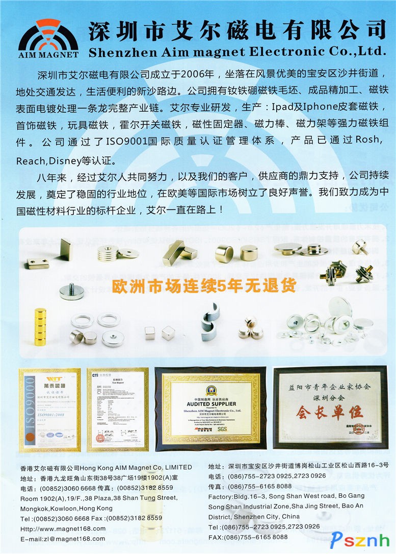 艾爾磁電產(chǎn)品主要應(yīng)用于高端數(shù)碼電子產(chǎn)品,高端皮具,智能家居,汽車配件等行業(yè)。2009年通過ISO9001國際質(zhì)量管理體系認(rèn)證,2014年通過SEDEX社會責(zé)任體系認(rèn)證,產(chǎn)品通過Rosh,Reach等環(huán)保檢測。公司歷經(jīng)10年穩(wěn)定發(fā)展,培養(yǎng)了強(qiáng)大的技術(shù)和服務(wù)團(tuán)隊(duì),擁有釹鐵硼強(qiáng)力磁鐵生產(chǎn)加工、表面電鍍處理一條龍產(chǎn)業(yè)鏈,已在業(yè)界樹立了良好的口碑,各種磁鐵和磁性材料制品已暢銷國,內(nèi)外。艾爾磁電將持續(xù)創(chuàng)造一個與員工,客戶,廠商共贏格局,致力成為磁性材料制品行業(yè)的標(biāo)桿企業(yè)。
