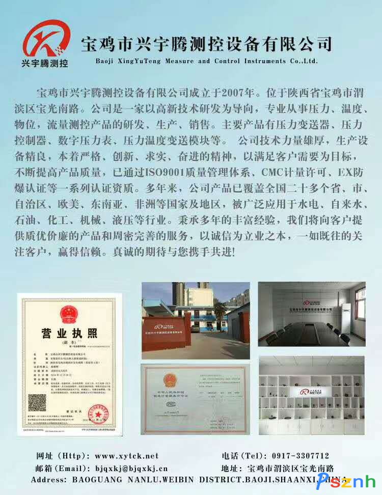 寶雞市興宇騰測控設(shè)備有限公司成立于2007年。位于陜西省寶雞市渭濱區(qū)寶 光南路。公司是一家以高新技術(shù)研發(fā)為導(dǎo)向,專業(yè)從事壓力、溫度、物位, 流量測控產(chǎn)品的研發(fā)、生產(chǎn)、銷售。主要產(chǎn)品有壓力變送器、壓力控制器、 數(shù)字壓力表、壓力溫度變送模塊等。