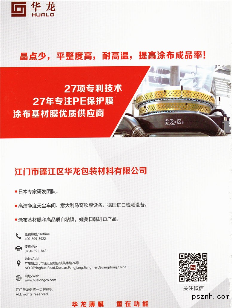 近30年來,江門華龍一直專注于研發(fā)、制造高品質(zhì)薄膜,主要包括多層共擠PE復(fù)合膜、微晶點PE保護膜及各種功能性PE薄膜。年產(chǎn)量達42000噸,在品質(zhì)、規(guī)模上均位居行業(yè)前列,深受國內(nèi)外客戶信任。