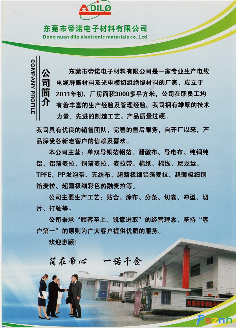 東莞市帝諾電子材料有限公司是一家專注于電線電纜輔助材料及絕緣屏蔽材料的生產(chǎn)廠家,公司擁有自己的核心技術(shù)。并配備先進(jìn)的檢測設(shè)備,良好的成本控制,為客戶提供優(yōu)良的服務(wù)。