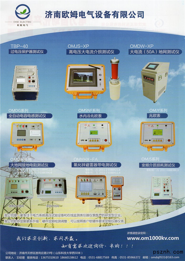 濟南歐姆電氣設(shè)備有限公司,簡稱:歐姆電氣。是一家專注于電力系統(tǒng)高壓試驗設(shè)備和在線監(jiān)測類儀器儀表生產(chǎn)的研發(fā)型企業(yè)。從2007年開始,公司專注于高壓檢測類儀器儀表研發(fā),主要為國內(nèi)知名企業(yè)從事OEM工作。2011年,公司借助自身先進(jìn)的技術(shù)力量和豐富的OEM經(jīng)驗,以高壓檢測設(shè)備生產(chǎn)為依托,以合作研發(fā)在線監(jiān)測類產(chǎn)品為契機,以嶄新的形象矗立于我國東方名城:泉城。目前,經(jīng)公司研發(fā)并且熱銷的產(chǎn)品有全自動精密介損測試儀,交直兩用型免拆線電容電感測試儀,無線傳輸型氧化鋅避雷器測試儀、異頻抗干擾大地網(wǎng)阻抗測試儀、5000V水內(nèi)冷兆歐表、智能型直流高壓發(fā)生器、容性設(shè)備在線測試儀、變壓器套管介損在線監(jiān)測、變壓器鐵芯接地在線監(jiān)測等。
