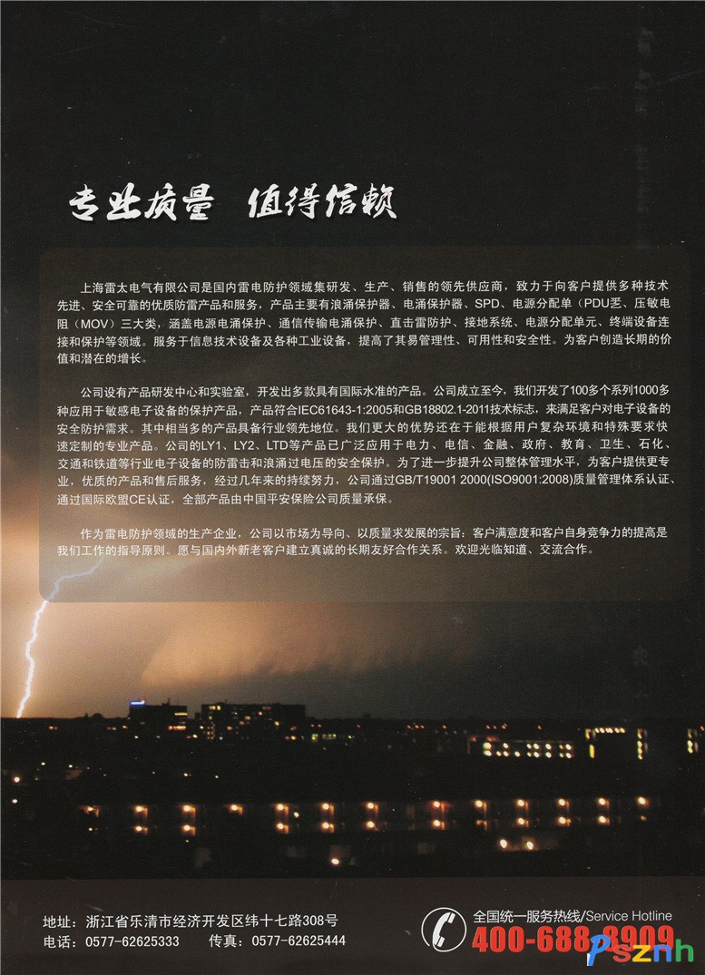 作為雷電防護領(lǐng)域的生產(chǎn)企業(yè),公司以市場為導(dǎo)向、以質(zhì)量求發(fā)展的宗旨:客戶滿意度和客戶自身競爭力的提高是我們工作的指導(dǎo)原則。愿與國內(nèi)外新老客戶建立真誠的長期友好合作關(guān)系。歡迎光臨知道、交流合作。 上海雷太電氣有限公司專業(yè)生產(chǎn):浪涌保護器、電涌保護器、SPD、防雷器、避雷器。