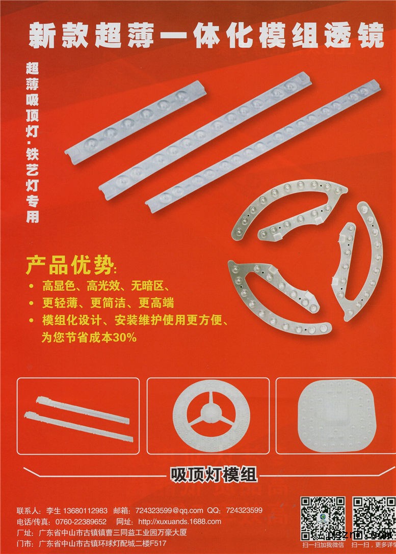 深圳市寶安區(qū)沙井旭軒照明燈飾配件廠專業(yè)從事2835、3030、4040、5050、 XPE、cree、COB、歐司朗等芯片 LED光學(xué)透鏡研發(fā)設(shè)計(jì)和生產(chǎn)的企業(yè),公司擁有一支經(jīng)驗(yàn)豐富的光學(xué)設(shè)計(jì)及模具設(shè)計(jì)團(tuán)隊(duì),公司具備精密模具制造、注塑設(shè)備。 進(jìn)行專業(yè)獨(dú)特的光學(xué)配光設(shè)計(jì),研發(fā)出多樣化且光效創(chuàng)新的光學(xué)透鏡,以符合客戶在LED照明產(chǎn)品上各種條件的需求。   深圳市寶安區(qū)沙井旭軒照明燈飾配件廠構(gòu)建了包含自主設(shè)計(jì)、研發(fā)制造成型于一體的LED光學(xué)配件產(chǎn)品生產(chǎn)體系,結(jié)合未來(lái)節(jié)能減排、環(huán)保潮流,旭軒與國(guó)際知名品牌保持緊密的LED光源技術(shù)合作關(guān)系,為其生產(chǎn)配套各種LED燈具光學(xué)配件,滿足各個(gè)領(lǐng)域的LED照明需要。旭軒堅(jiān)持“精益求精,服務(wù)至上”的務(wù)實(shí)進(jìn)取精神,以品質(zhì)打造市場(chǎng),以誠(chéng)信鑄造品牌,公司自成立以來(lái)憑借著優(yōu)質(zhì)的產(chǎn)品、良好的服務(wù)贏得了國(guó)內(nèi)外客戶的一致好評(píng),也是國(guó)內(nèi)外眾多馳名品牌燈具企業(yè)及芯片商的合作商。成為L(zhǎng)ED燈具界具有良好口碑的公司。公司秉持”質(zhì)量第一,顧客至上;合作雙贏”的經(jīng)營(yíng)理念. 誠(chéng)摯歡迎各界朋友到我公司參觀,考察,指導(dǎo)與洽談業(yè)務(wù)!我們將竭誠(chéng)為您提供最有質(zhì)量的產(chǎn)品、最為周到的服務(wù)!