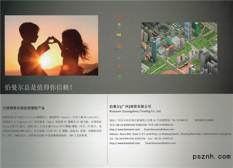 廣州市伯曼爾商貿(mào)有限公司作為一家專營環(huán)保塑膠產(chǎn)品的公司已有15年的歷史,是一間創(chuàng)新型快速發(fā)展的公司,業(yè)務(wù)涉及到LED照明領(lǐng)域,建材廣告,電子,印刷,家電,家居等工業(yè)領(lǐng)域。公司一直以來致力于引進(jìn)國內(nèi)外知名品牌 (包括美國、德國、日本、臺灣、韓國)等多間大型塑膠公司之產(chǎn)品并負(fù)責(zé)在中國區(qū)域的推廣銷售及市場維護(hù)。是目前國內(nèi)行業(yè)中的優(yōu)質(zhì)材料供應(yīng)商。并以追求產(chǎn)品卓越,與時俱進(jìn),誠信服務(wù)為理念贏得了行業(yè)的廣泛認(rèn)可與支持。