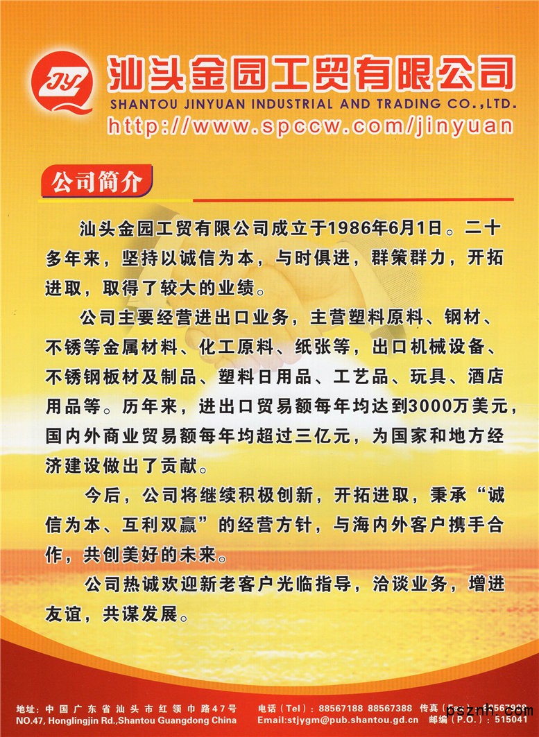 汕頭金園工貿(mào)有限公司主要經(jīng)營進(jìn)出口業(yè)務(wù)、國內(nèi)外貿(mào)易。主營塑料原料、化工原料、金屬材料、紙張,出口機(jī)械設(shè)備、不銹鋼板材及制品、塑料日用品、工藝品、金屬制品、酒店用品、服裝等。在國內(nèi)外貿(mào)易業(yè)務(wù)中,公司恪守信用,廣交朋友,與國內(nèi)外客戶建立了良好的合作關(guān)系,樹立了較高的聲譽(yù),進(jìn)出口貿(mào)易每年均超過2000萬美元,國內(nèi)商業(yè)貿(mào)易額每年均超過一億元。 經(jīng)過二十多年的創(chuàng)業(yè)、開拓與發(fā)展,公司建成一批工業(yè)廠房及設(shè)施,形成規(guī)?;墓I(yè)生產(chǎn)、出口貿(mào)易基地,擁有較強(qiáng)的經(jīng)濟(jì)實(shí)力。今后,公司將積極創(chuàng)新,開拓進(jìn)取,秉承“誠信為本、互利雙贏”的經(jīng)營方針,與海內(nèi)外客戶攜手合作,共創(chuàng)美好的未來。