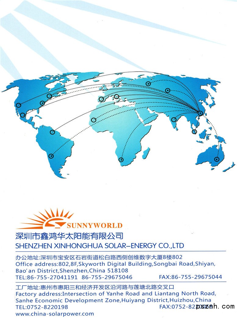 公司成立于2003年, 是國(guó)內(nèi)成立較早的光伏組件生產(chǎn)商,也是獲得深圳市政府認(rèn)可的高新技術(shù)企業(yè)。公司一直致力于太陽(yáng)能組件的研發(fā),制造及銷(xiāo)售。我們的產(chǎn)品覆蓋了3W至340W的單晶/多晶硅太陽(yáng)能組件,40W至200W的可折疊組件, 10W至300W的柔性組件。同時(shí)可根據(jù)客戶要求定制各種特殊規(guī)格的組件。