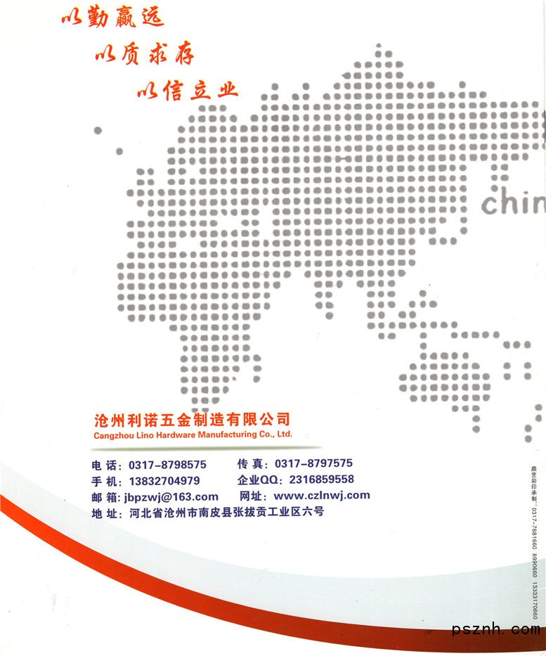 滄州利諾五金制造有限公司成立于2012年(原南皮縣長松五金廠)。公司新址地理位置優(yōu)越,交通便利。坐落于南皮五金產(chǎn)業(yè)區(qū)中心地帶。近年來,公司不斷加強(qiáng)、完善硬件設(shè)施。在提高生產(chǎn)效率、完善品質(zhì)的同時(shí),更為客戶提供了個(gè)性化、全方位、高水平的服務(wù)。