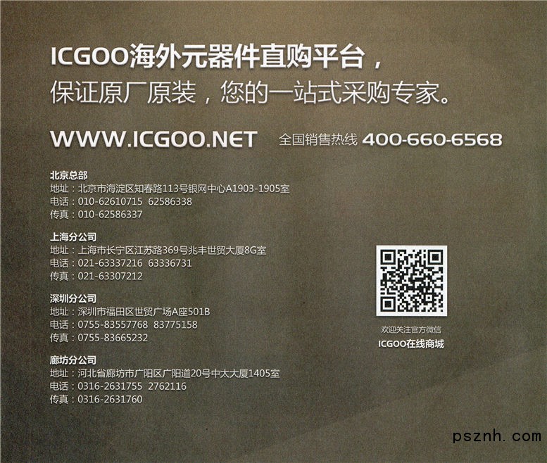 •   ICGOO的客戶群體覆蓋了所有可以應(yīng)用電子元器件產(chǎn)品的用戶。您可以是大、中、小型的國內(nèi)貿(mào)易商,也可以是國個(gè)各個(gè)領(lǐng)域的生產(chǎn)型企業(yè),還可以是國內(nèi)各類科研機(jī)構(gòu)及高校實(shí)驗(yàn)室。當(dāng)然,如果你是熱衷于電子產(chǎn)品DIY的愛好者,同樣也能夠與ICGOO這一開放的平臺合作。您只需登陸我們的網(wǎng)站www.icgoo.net或者直接與我們的客服人員聯(lián)系,提出您的要求,我們都會在第一時(shí)間為您尋找適合您的產(chǎn)品。