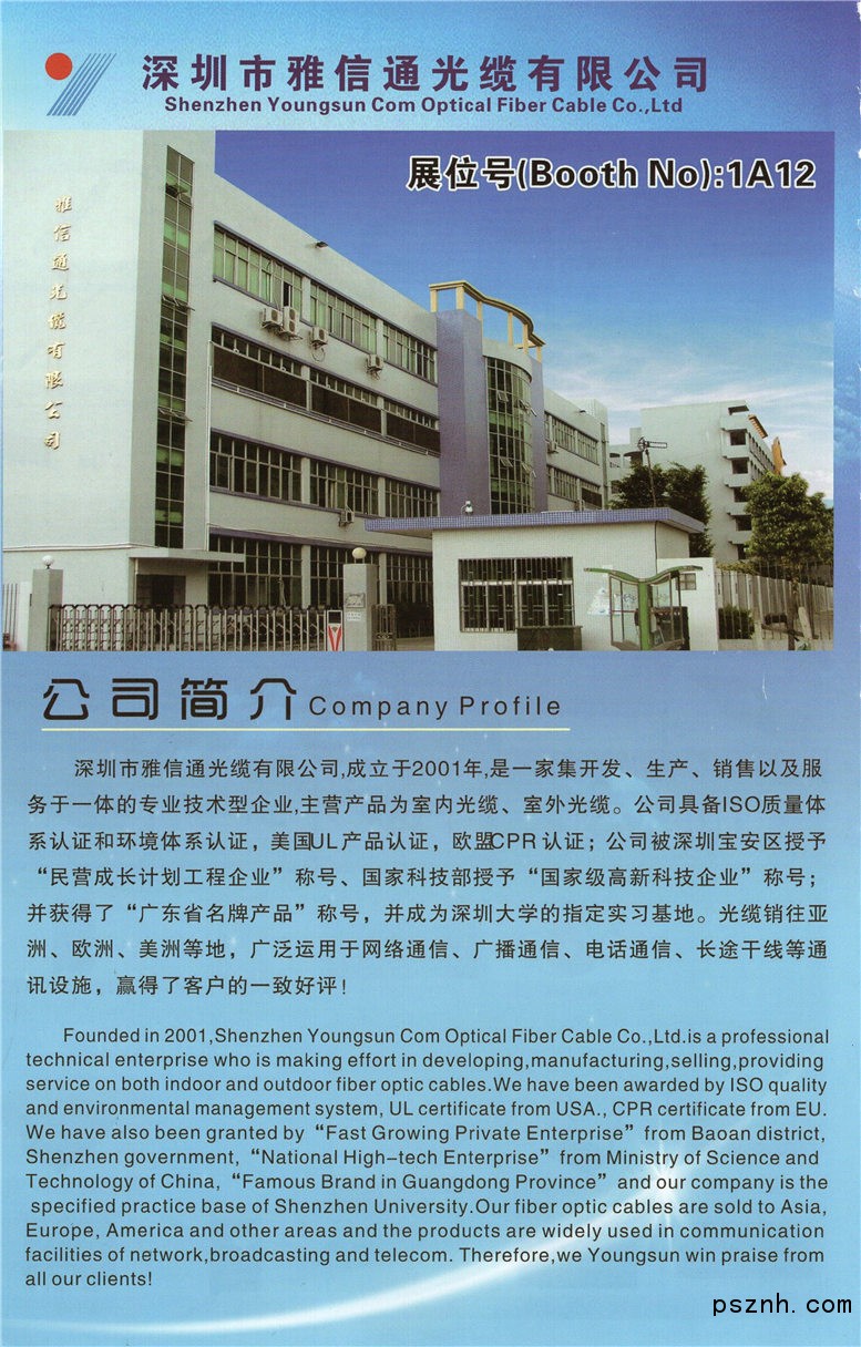 雅信通不斷創(chuàng)新, 開發(fā)了包括通信業(yè)界所使用的室內(nèi)光纜和室外光纜,2002年,公司率先研發(fā)了低煙無鹵光纜,成為國內(nèi)第一家生產(chǎn)低煙無鹵室內(nèi)光纜的廠家。配合市場的需求,公司還推出了FTTH光纜、OFNP光纜、48芯一管式束狀軟光纜、2~144芯分單元光纜、2~288芯迷你型配線光纜、野戰(zhàn)光纜、2-48芯分支光纜、2~144芯自承式室外光纜等一系列具有影響力的產(chǎn)品。自建廠以來,公司的產(chǎn)品已獲得了UL OFNR、UL OFNP、ROHS等國際性認證。主要銷往亞洲、歐洲、美洲等地,并廣泛運用于軍隊、廣播電視、電話通信、高速公路、地鐵、機場等通訊設(shè)施,贏得了客戶的一致好評,并多次獲得了客戶授予的最佳供應商榮譽稱號。