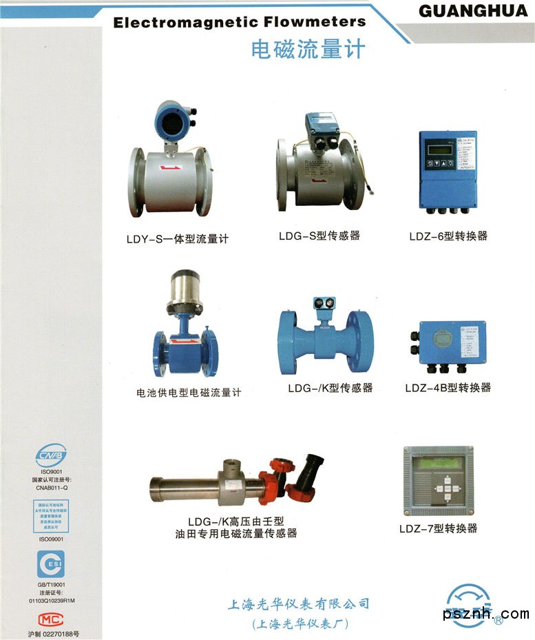 海光華儀表有限公司(原上海光華儀表廠、中國核工業(yè)集團公司國營二六四廠)建于1934年,是中國最早的流量儀表廠,也是全國最早的幾家自動化儀表制造企業(yè)之一,專業(yè)生產(chǎn)各種流量、差壓、壓力、液位等工業(yè)自動化儀表。產(chǎn)品廣泛用于測量液體、氣體或蒸汽的流量,以及測量差壓、壓力和液位等參量,部分產(chǎn)品已進入國際市場。LD系列電磁流量計(包括管道式、潛水式)是上海最早通過環(huán)保認證的產(chǎn)品(№0001)。光華牽頭制定了核安全級差壓/壓力變送器專業(yè)標準(EJ/T1046-1997);電磁流量計專業(yè)標準(JB/T9248)及國家標準(GB/T18659-2002、GB/T18660-2002);參與制定了軍標“船用電磁流量計”。