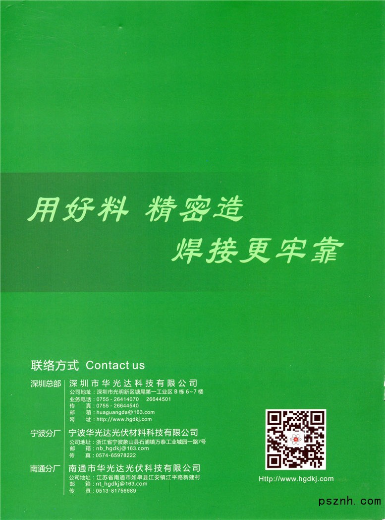 公司創(chuàng)始人魏光炎教授自1999年開始主持太陽能電池組件的工藝開發(fā)及生產(chǎn),在此積累了豐富的經(jīng)驗(yàn)。2005年創(chuàng)立華光達(dá)公司以來,不斷改良工藝、開發(fā)新品,先后研制生產(chǎn)了含鉛(TM-A),環(huán)保型 (TM-B)、含鉛含銀(TM-C)光伏焊帶以及薄膜電池配套的超薄焊帶,各種規(guī)格型號(hào)產(chǎn)品多達(dá)300余種,年組件配套能力超過5GW。公司管理執(zhí)行ISO9001體系,生產(chǎn)的光伏焊帶 (也稱涂錫帶/涂錫銅帶/互連條/匯流帶)產(chǎn)品表面光亮、涂層均勻、可焊性好、導(dǎo)電性能高;環(huán)保型光伏焊帶已通過SGS檢測認(rèn)證,符合歐盟RoHS標(biāo)準(zhǔn).產(chǎn)品遠(yuǎn)銷歐洲、東南亞等地。