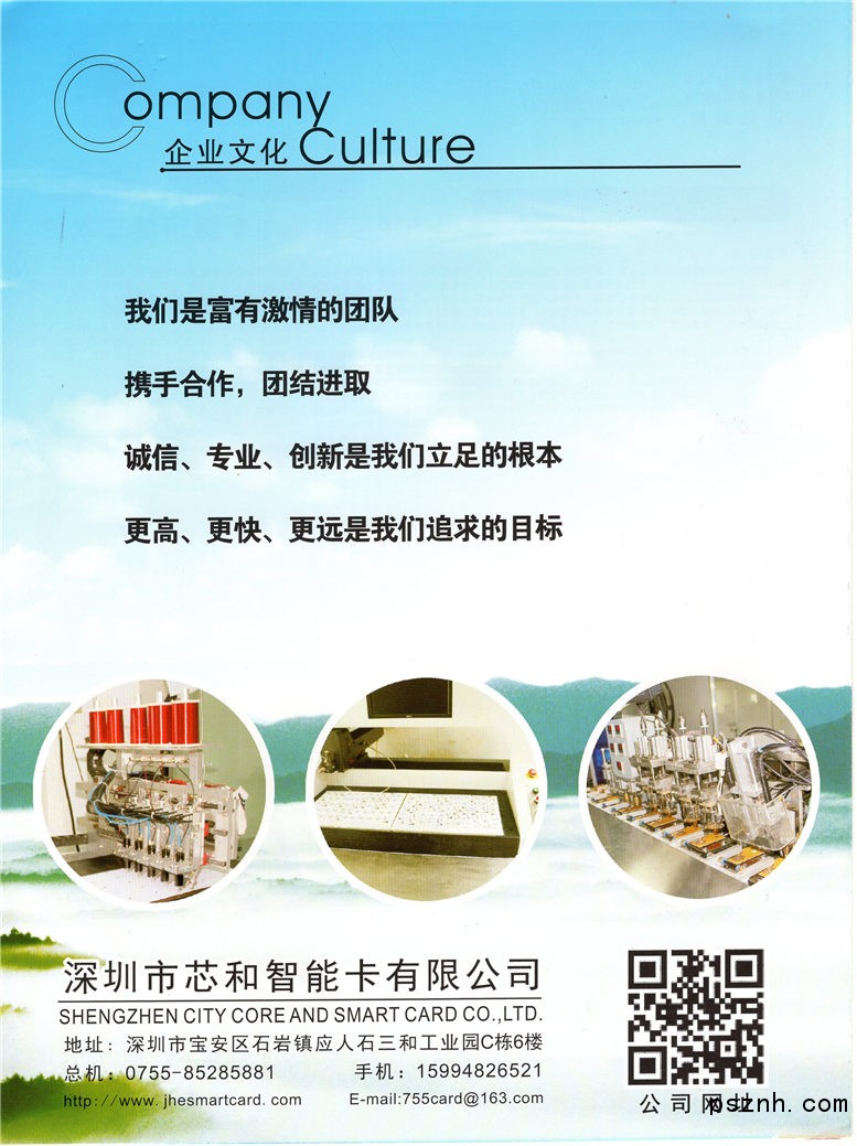 深圳市芯和智能卡有限公司座落于秀麗的海濱城市深圳 ,2002年8月1日投入生產(chǎn),是一家集科研、生產(chǎn)、銷售、工程于一體的高科技企業(yè),具有400多員工。有4000平米的無塵生產(chǎn)車間,專業(yè)生產(chǎn)各種非接觸式和接觸式IC卡、ID卡、MI卡、校訊通卡、可視卡、門禁卡、金屬卡、滴膠卡、磁條卡、會(huì)員卡、條碼卡、工作證卡等各類PVC卡與ID與IC芯料;各種讀卡器與會(huì)員管理系統(tǒng)。并致力于綠色環(huán)保材料制卡的推廣事業(yè)。擁有多年豐富的生產(chǎn)管理經(jīng)驗(yàn),公司在2006年以來對(duì)全體員工進(jìn)行7S管理導(dǎo)入每位員工對(duì)產(chǎn)品質(zhì)量管理水平。引進(jìn)先進(jìn)的制卡流水生產(chǎn)線:海德堡四色彩印機(jī)、全自動(dòng)合成機(jī)、高速?zèng)_卡機(jī)、全自動(dòng)高速裱磁機(jī)、平碼機(jī)、高速凸碼機(jī)、全自動(dòng)高速燙金機(jī)、高速全自動(dòng)識(shí)別噴碼貼標(biāo)機(jī)、全自動(dòng)高速線圈成形機(jī)、全自動(dòng)IC卡封裝設(shè)備等,全套制卡行業(yè)的先進(jìn)設(shè)備,年生產(chǎn)能力達(dá)到3億張以上。產(chǎn)品的各項(xiàng)指標(biāo)均達(dá)到國(guó)際信用卡標(biāo)準(zhǔn)?;捎眠M(jìn)口的高品質(zhì)PVC材料和PET、PS、PP、PC等環(huán)保材料,油墨、芯片均采用進(jìn)口與名牌產(chǎn)品,原料全部達(dá)到國(guó)際環(huán)保標(biāo)準(zhǔn)??纱_保為廣大用戶提供高品質(zhì)的產(chǎn)品。嚴(yán)控制半成品,對(duì)廢品及時(shí)粉碎處理,保障用戶合法權(quán)益。為更好服務(wù)國(guó)內(nèi)用戶,為順應(yīng)飛速發(fā)展,建和人充分發(fā)揮地處特區(qū),毗領(lǐng)港澳的優(yōu)勢(shì),立足深圳,輻射全國(guó);而且在國(guó)際市場(chǎng)中已經(jīng)和加拿大、新西蘭、澳州、巴基斯坦、俄羅斯、歐美等地建立了良好的合作關(guān)系!