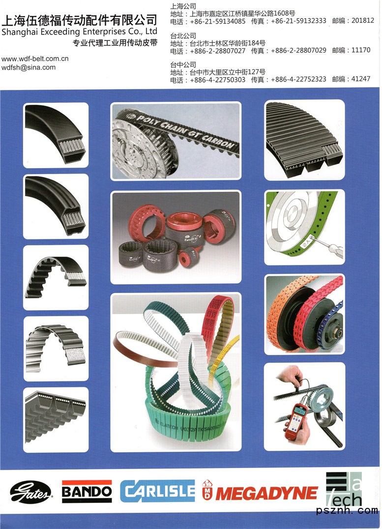 上海伍德福傳動(dòng)配件有限公司系臺(tái)資企業(yè)、臺(tái)灣“伍德福企業(yè)有限公司”之關(guān)系企業(yè)。我司在臺(tái)灣專業(yè)經(jīng)營工業(yè)用皮帶,有三十余年歷史;系美國GATES與CARLISLE(前DAYCO),及日本BANDO等名牌之代理商,并連續(xù)數(shù)年榮獲GATES與BANDO頒發(fā)“亞太地區(qū)”代理商之最佳業(yè)績表現(xiàn)獎(jiǎng)。