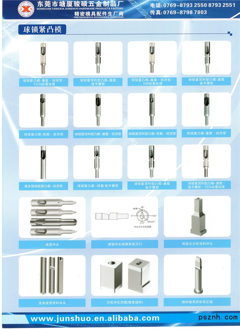 東莞市塘廈駿碩五金制品廠 本公司成立于2005年,位于東莞市塘廈鎮(zhèn)林村占地為200000平方米的鯉牙塘工業(yè)園內(nèi)?,F(xiàn)有100多人,是一家集生產(chǎn)和銷售于一體為模具生產(chǎn)供應(yīng)系列產(chǎn)品與配套的專業(yè)公司。主要產(chǎn)品有:五金模、沖壓模、汽車模、端子模等模具標(biāo)準(zhǔn)及非標(biāo)準(zhǔn)精密配件( 導(dǎo)柱導(dǎo)套、 耐磨板 ) 、精密級 HASCO、 D-M-E 、DANLY、伍全、盤起、MISUMI、FIBRO、Lamina、Lempco、三楔、日本大同等各國標(biāo)準(zhǔn)精密模具配件。接受客戶指定材料附圖加工,公司同時致力發(fā)展汽車、機(jī)械、電子等領(lǐng)域的標(biāo)準(zhǔn)非標(biāo)準(zhǔn)高精軸套類產(chǎn)品的生產(chǎn)與配套。