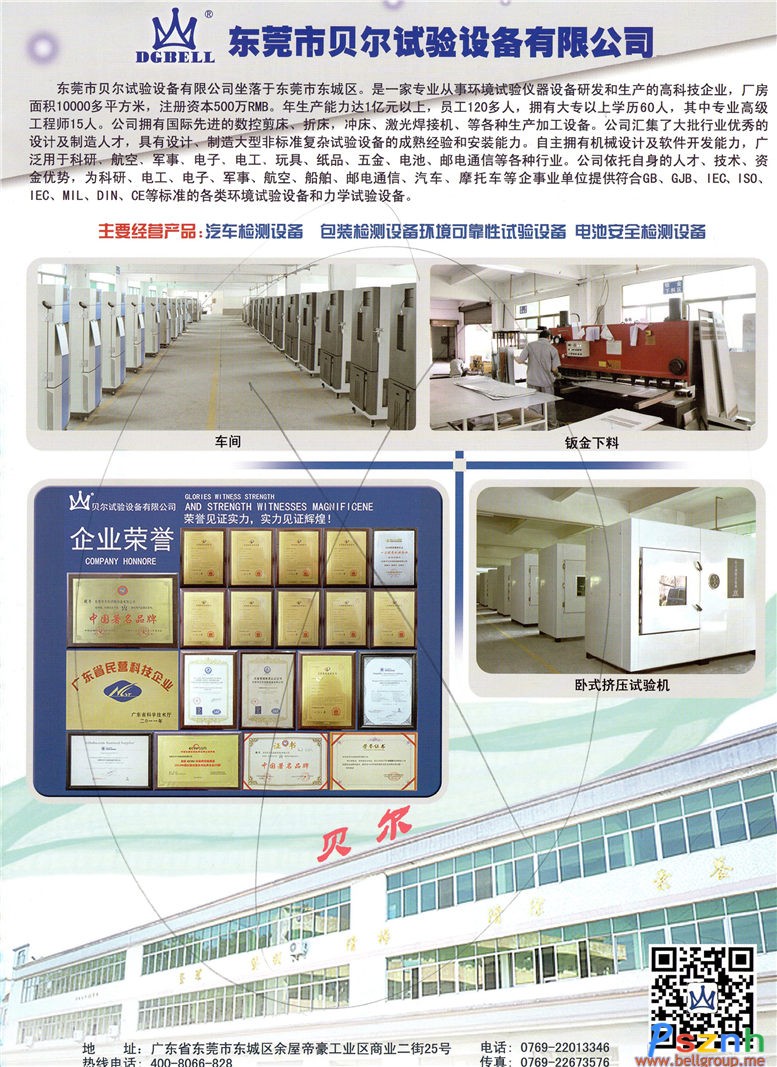 東莞市貝爾試驗(yàn)設(shè)備有限公司  坐落于東莞市東城區(qū)。是一家專業(yè)從事環(huán)境試驗(yàn)儀器設(shè)備研發(fā)和生產(chǎn)的高科技企業(yè),廠房面積10000多平方米,注冊(cè)資本500萬(wàn)RMB。年生產(chǎn)能力達(dá)1億元以上,員工120多人,擁有大專以上學(xué)歷60人,其中專業(yè)高級(jí)工程師15人。公司擁有國(guó)際先進(jìn)的數(shù)控剪床、折床,沖床、激光焊接機(jī)、等各種生產(chǎn)加工設(shè)備。公司匯集了大批行業(yè)優(yōu)秀的設(shè)計(jì)及制造人才,具有設(shè)計(jì)、制造大型非標(biāo)準(zhǔn)復(fù)雜試驗(yàn)設(shè)備的成熟經(jīng)驗(yàn)和安裝能力。自主擁有機(jī)械設(shè)計(jì)及軟件開(kāi)發(fā)能力,廣泛用于科研﹑航空﹑軍事﹑電子﹑電工﹑玩具、紙品、五金、電池、郵電通信等各種行業(yè)。公司依托自身的人才、技術(shù)、資金優(yōu)勢(shì),為科研、電工、電子、軍事、航空、船舶、郵電通信、汽車、摩托車等企事業(yè)單位提供符合GB、GJB、IEC、ISO、IEC、MIL、DIN、CE等標(biāo)準(zhǔn)的各類環(huán)境試驗(yàn)設(shè)備和力學(xué)試驗(yàn)設(shè)備。