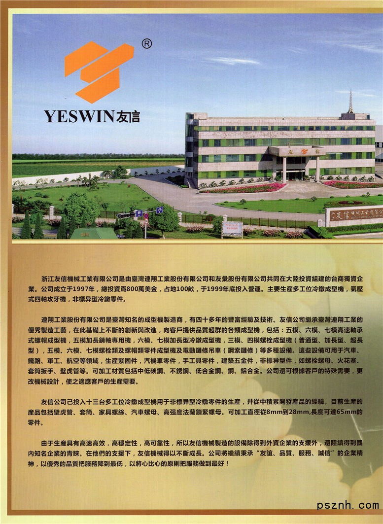 浙江友信機(jī)械工業(yè)有限公司 是由臺灣連翔工業(yè)股份有限公司和友匯股份有限公司共同在大陸投資組建的臺商獨資企業(yè)。公司成立于1997年,總投資為800萬美元,占地100畝,于1999年底投入生產(chǎn),地處浙北,交通方便。主要生產(chǎn)多工位冷鐓成型機(jī),氣壓式四軸攻牙機(jī);非標(biāo)異型冷鍛零件。