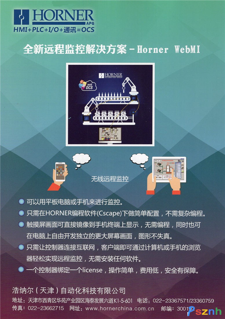 浩納爾(天津)自動化科技有限公司為美國Horner APG公司在中國投資的分公司,主要負(fù)責(zé)Horner 產(chǎn)品在中國的推廣和技術(shù)服務(wù),為您提供低成本,高性能的一體化控制產(chǎn)品解決方案; 并承接自動化工程項目,為您定制品質(zhì)優(yōu)越、更適合工業(yè)應(yīng)用的一體化控制方案,我公司技術(shù)實力雄厚,并擁有來自美國HornerAPG總部的全力支持。選擇HORNER的控制產(chǎn)品一定會給您帶來更優(yōu)的解決方案,使控制變得更加簡捷方便!