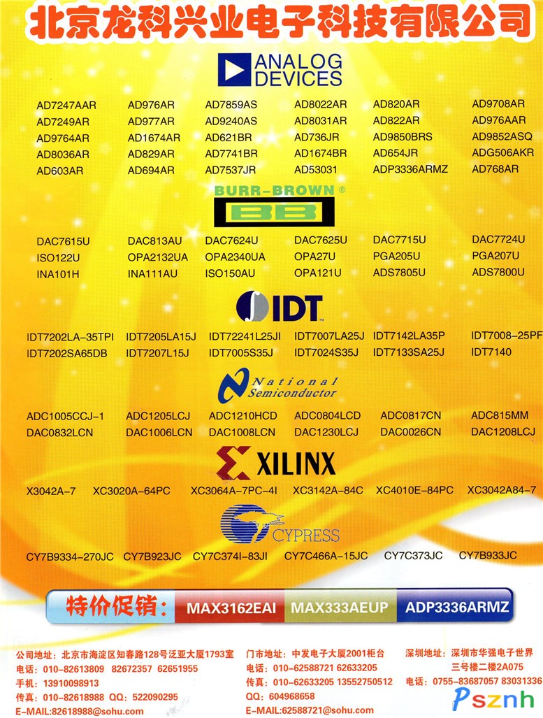 主營(yíng)范圍:• 可編程邏輯類,包含 CPLD, FPGA及相關(guān)配置芯片,產(chǎn)品線有Xilinx; Altera; Lattice; Actel。 • 處理器類,包括 MCU, PowerPC, VoPP, DSP等,產(chǎn)品線有TI; Aodiocodes; Free Scale; Atmel。 • 存儲(chǔ)器類,包括 SRAM, DRAM和 FLASH等,產(chǎn)品線有 Cypress; Hynix; SST; Spansion。 • 通信及網(wǎng)絡(luò)應(yīng)用類,產(chǎn)品線有 Zarlink; PMC-sierra; Mindspeed; Legerity; Infineon。 • 微波射頻與頻率控制類,產(chǎn)品線有 M/A-com; Free Scale; Peregrine; MINI; WJ; Anadigics; Hittite; • 線性器件與電源管理類,產(chǎn)品線有IR;TI; FSC; ST; Linear; PI; Powerdsine。 . • 分立與被動(dòng)元件類,包括鉭電容和保護(hù)器件,產(chǎn)品線有Littelfuse; Kemet; Raychem; Bourns。 • 機(jī)電類元件類,包括繼電器,產(chǎn)品線有 TYCO/OEG.