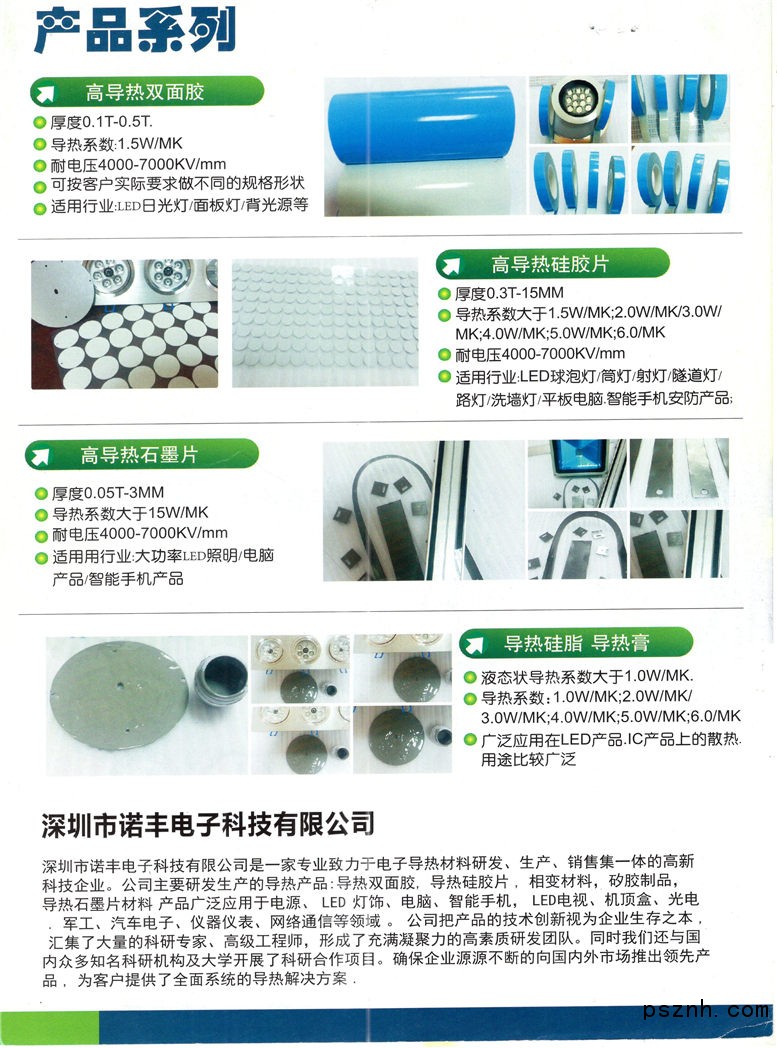 深圳市諾豐電子科技有限公司是一家專業(yè)致力于電子導(dǎo)熱散熱材料研發(fā)、生產(chǎn)、銷售集一體的高新科技企業(yè)。公司研發(fā)生產(chǎn)的導(dǎo)熱散熱材料有:導(dǎo)熱雙面膠,導(dǎo)熱硅膠片,導(dǎo)熱硅脂,導(dǎo)熱灌封膠,矽膠制品,導(dǎo)熱石墨片材料,及各種導(dǎo)熱材料等。產(chǎn)品廣泛應(yīng)用于電源、LED燈飾、安防、電腦、LED電視、機(jī)頂盒、光電.軍工、汽車電子、儀器儀表、網(wǎng)絡(luò)通信等領(lǐng)域。