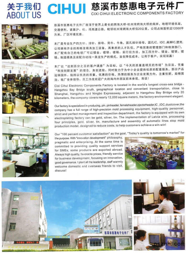 慈溪慈惠電子元件廠創(chuàng)建于2002年,主要生產(chǎn)鍍金四方針,排針,排母,簡牛,牛角,IDC ,IC D-SUB,白色針座廣泛用于能電表LED顯示屏、LED照明、計(jì)算機(jī)、消費(fèi)性電子及通訊設(shè)備等領(lǐng)域,公司設(shè)立自動(dòng)PIN針車間,連接器裝配車間,注塑車間,電鍍車間(鍍金,鍍銀,鍍錫)公司已通過ISO9001:2008質(zhì)量管理體系認(rèn)證及ISO14001:2004環(huán)境體系認(rèn)證,所生產(chǎn)產(chǎn)品已通過歐盟CE認(rèn)證。通過不斷創(chuàng)新使產(chǎn)品更具競爭力。       公司所生每一個(gè)產(chǎn)品均符合歐盟RoHS環(huán)保指令要求,每年定期將所生產(chǎn)產(chǎn)品送往上海SGS測試機(jī)構(gòu)進(jìn)行測試,公司內(nèi)部也擁有獨(dú)立的實(shí)驗(yàn)室,能夠完成電氣、機(jī)械及環(huán)境性能的測試,儀器包括高低溫恒溫恒濕測試儀、全自動(dòng)電腦控制拉拔力測試儀、顯微硬度測試儀、CCD影像測量儀、抗拉強(qiáng)度測試儀、溫升測試儀、老化實(shí)驗(yàn)箱、鹽霧測試機(jī)、絕緣阻抗測試儀、接觸阻抗測試儀高壓測試儀、洛氏硬度測試儀、紅外線回流焊機(jī)、RoHS環(huán)保測試儀、電鍍膜厚X-RAY測試儀及震動(dòng)測試儀等。