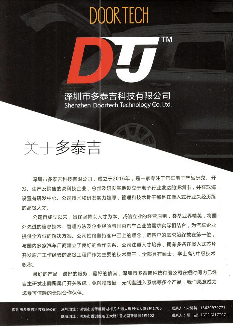深圳市多泰吉科技有限公司辦公室地址位于中國個經濟特區(qū),鵬城深圳,深圳 深圳市龍華新區(qū)民治街道民康路東明大廈419,于2016年10月20日在深圳市市場監(jiān)督管理局注冊成立,注冊資本為500萬元,在公司發(fā)展壯大的2年里,我們始終為客戶提供好的產品和技術支持、健全的售后服務,我公司主要經營電子通信與自動控制技術研究、技術開發(fā);機器人的技術研究、技術開發(fā);計算機技術開發(fā);機械工程設計;模型設計;智能化安裝工程設計;通信技術研究開發(fā);電氣機械設備銷售;電線、電纜批發(fā);貨物及技術進出口;智能機器銷售;電子產品銷售;信息系統(tǒng)集成技術開發(fā);信息技術咨詢;軟件開發(fā);電氣設備批發(fā);國內貿易。(依法須經批準的項目,...,我們有好的產品和專業(yè)的銷售和技術團隊,我公司屬于深圳竹木加工公司行業(yè),如果您對我公司的產品服務有興趣,期待您在線留言或者來電咨詢