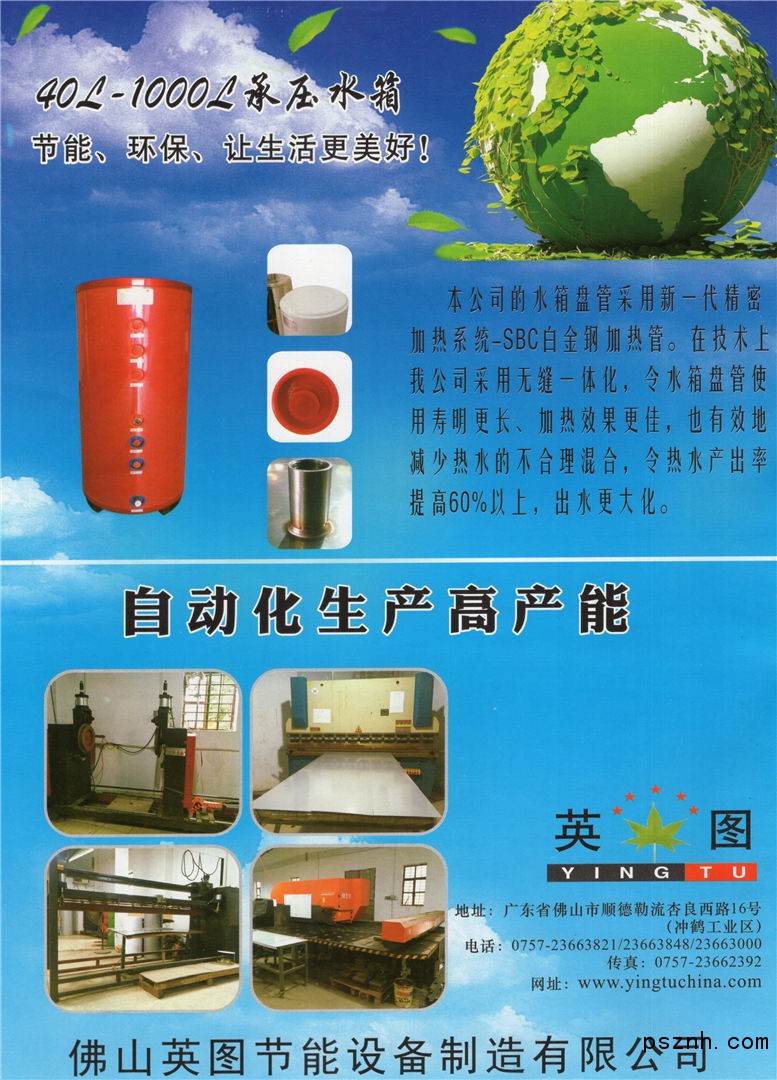 佛山市英圖節(jié)能設(shè)備制造有限公司成立于2005年,專業(yè)生產(chǎn)包括空氣源熱水器承壓水箱、太陽能水箱等各類水箱產(chǎn)品。我司位于佛山市順德區(qū)勒流鎮(zhèn)富裕石涌工業(yè)區(qū),占地面積達(dá)12000平方米,位置優(yōu)越,交通便利。