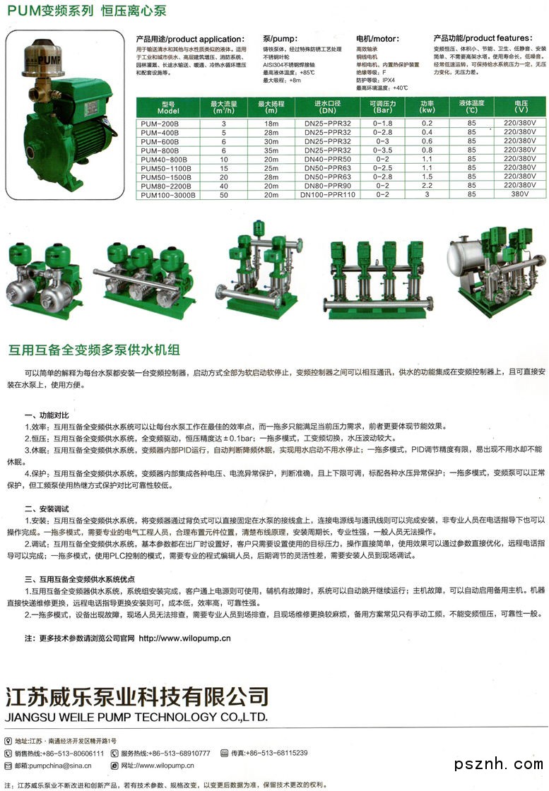 江蘇威樂泵業(yè)科技有限公司一直致力于蘇電智能變頻恒壓供水系統(tǒng)的開發(fā)生產(chǎn)與銷售,經(jīng)過蘇電公司技術(shù)人員進(jìn)十幾年的開發(fā), 成功的開發(fā)出智能變頻恒壓控制器和水泵完美的一體機(jī)組合,組合成完美的恒壓供水系統(tǒng)。使用先進(jìn)的IC技術(shù),強(qiáng)大靈活的人 性化設(shè)計(jì),成功推出了成熟可靠的變頻恒壓系統(tǒng)產(chǎn)品,控制技術(shù)已經(jīng)久經(jīng)考驗(yàn),組合方式完美,簡單易操作的面板, 壓力直接顯示 在控制器上面,使用戶在調(diào)試水泵時(shí)不需要專業(yè)的技術(shù)人員來指導(dǎo),公司一直以來堅(jiān)持以(全自動(dòng)科學(xué)供水,節(jié)能環(huán)保,簡單的安裝 調(diào)試,平民化的價(jià)格)為中國的供水事業(yè)努力,本著薄利經(jīng)營的服務(wù)方針,建立長期的業(yè)務(wù)合作關(guān)系為基礎(chǔ),為客戶提供最滿意的 優(yōu)質(zhì)產(chǎn)品和長期信賴的技術(shù)售后服務(wù),蘇電變頻系列。真真的泵浦變頻專家,更多的恒壓供水系統(tǒng)方案盡請(qǐng)垂詢。