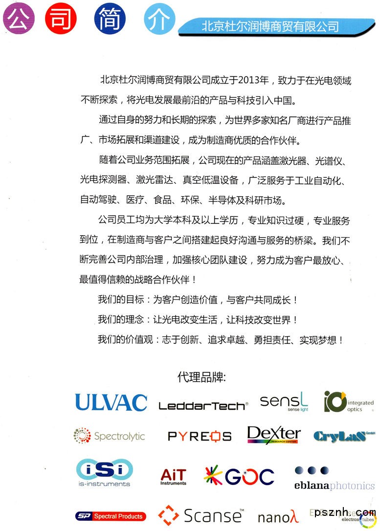 北京杜爾潤博商貿(mào)有限公司成立于2013年,專注光電領(lǐng)域,致力于將光電行業(yè)最前沿的產(chǎn)品與科技引入中國。我們通過不懈的努力,已經(jīng)成為世界光電領(lǐng)域內(nèi)的多家制造廠商的優(yōu)質(zhì)合作伙伴。積極進(jìn)取地為他們在中國進(jìn)行產(chǎn)品推廣、市場拓展和渠道建設(shè)。我們將優(yōu)質(zhì)高科技的光電產(chǎn)品引入國內(nèi),幫助科研機(jī)構(gòu)與科技公司改善產(chǎn)品應(yīng)用、提高性能質(zhì)量。共享科技,傳遞價值!