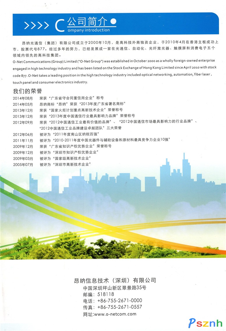 昂納信息技術(shù)(深圳)有限公司成立于2000年10月,是國家火炬計劃重點高新技術(shù)企業(yè),國家級企業(yè)技術(shù)中心。公司于2010年4月在香港主板成功上市,股票代號877。昂納總部設(shè)在深圳,同時在北京、杭州、香港、北美和歐洲設(shè)有多家分公司,公司品牌為“O-Net”。作為一家經(jīng)歷過早年的光通信行業(yè)寒冬并頑強生存下來的企業(yè),昂納通過近20年的奮斗,成長為世界上最大的光通信器件和模塊供應(yīng)商之一,并在工業(yè)應(yīng)用、機器視覺、鍍膜及新材料多個高科技領(lǐng)域領(lǐng)跑。