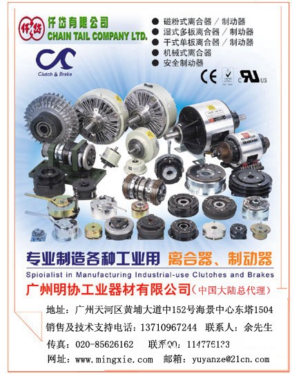 廣州明協(xié)工業(yè)器材有限公司(13710967244余彥澤)是臺灣仟岱有限公司在中國大陸的總代理。主要產(chǎn)品有“仟岱”牌電磁 式離合器、磁粉式離合器、 磁粉式剎車器、電磁式剎車器、電磁式制動器、磁粉式制動器等。品種齊全、質(zhì)量可靠、供貨穩(wěn)定、價格最實惠!臺灣仟岱產(chǎn)品在設(shè)備材料方面使用了最佳導(dǎo)磁率的材質(zhì),來令片使用摩擦系數(shù)高,底摩耗的高級非石綿來令片,提高產(chǎn)品的應(yīng)答時間及產(chǎn)品的使用壽命 。