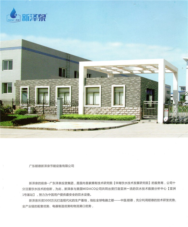 廣東順德新澤泉節(jié)能設(shè)備有限公司,是專業(yè)從事健康飲水技術(shù)研究、校園開水器和飲水設(shè)備的技術(shù)研發(fā)、制造、銷售、服 務(wù)于一體的國家級高新技術(shù)企業(yè),致力于為大眾提供健康安全、節(jié)能高效的公共飲水設(shè)備,為社會提供全系列飲水解決方案。 新澤泉的前身一一廣東澤泉投資集團,是國內(nèi)首家擁有技術(shù)研究院【華南飲水技術(shù)發(fā)展研究院】的服務(wù)商,公司十分注重 飲水技術(shù)的創(chuàng)新,為此,新澤泉與美國MIDACO公司共同出資打造亞洲一流的飲水技術(shù)數(shù)據(jù)分析中心【亞洲1號基站】,努力為中國 用戶提供最安全的飲水設(shè)備。 新澤泉斥資3000萬元打造現(xiàn)代化的生產(chǎn)基地,地處全球電器之都一一中國·順德,充分利用順德的技術(shù)研發(fā)優(yōu)勢、全產(chǎn)業(yè) 鏈的配套優(yōu)勢、電器制造優(yōu)勢和物流港口優(yōu)勢,將新澤泉從順德推向全中國。公司擁有行業(yè)資深的研發(fā)團隊,對凈水技術(shù)、制造 工藝不斷提升,始終保持技術(shù)的先進性,公司擁有的“飲水設(shè)備智能變頻技術(shù)”、 “高硬度水的纖維膜處理技術(shù)”、 “換 熱器的無焊接技術(shù)”等均已達到國際先進水平:新澤泉擁有經(jīng)驗豐富的生產(chǎn)管理人才,對生產(chǎn)制造流程的進行精細化、標準化管 控,始終保持質(zhì)量的穩(wěn)定性。