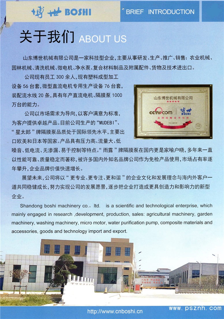 公司以市場需求為導(dǎo)向,以客戶滿意為標(biāo)準(zhǔn),為客戶提供卓越產(chǎn)品。目前公司農(nóng)林科技版塊生產(chǎn)的“MUDEBI”、“星太郎”牌隔膜泵品質(zhì)處于國際領(lǐng)先水平,主要出口歐美和日本等國家。 凈水科技版塊“魯博士”“雨露”牌隔膜泵在國內(nèi)更是家喻戶曉,多年來一直以性能可靠、質(zhì)量穩(wěn)定而著稱,被許多國內(nèi)外知名品牌公司作為免檢產(chǎn)品使用,市場占有率逐年攀升,企業(yè)品牌價值快速增長。