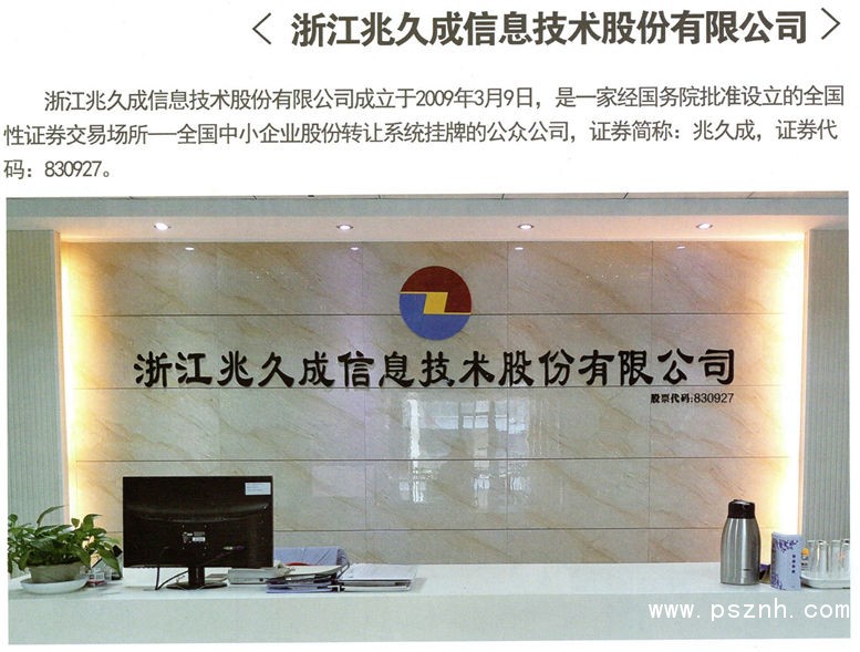 浙江兆久成信息技術(shù)股份有限公司成立于2009年3月9日,是一家經(jīng)國務(wù)院批準(zhǔn)設(shè)立的全國性證券交易場所---全國中小企業(yè)股份轉(zhuǎn)讓系統(tǒng)掛牌的公眾公司,證券簡稱:兆久成,證券代碼:830927 。