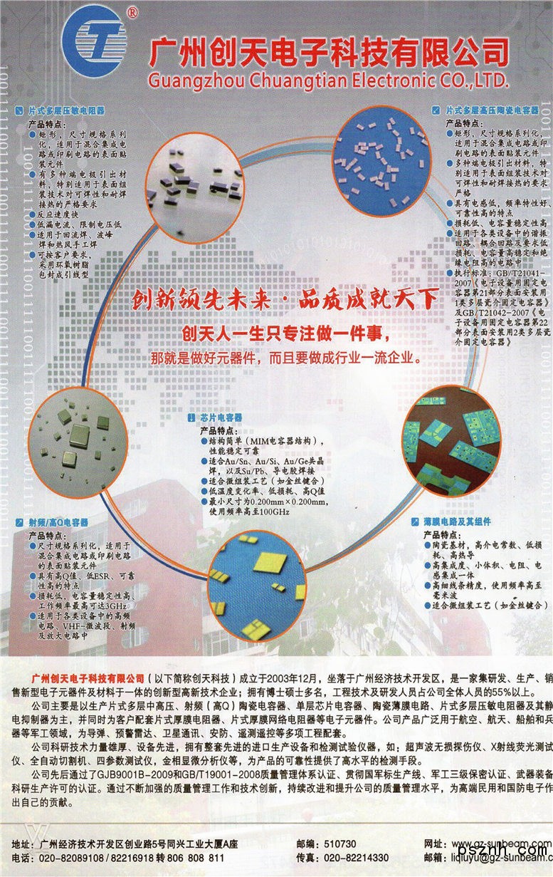 廣州創(chuàng)天電子科技有限公司(以下簡稱創(chuàng)天科技)成立于2003年12月,座落于廣州經(jīng)濟技術開發(fā)區(qū),是一家集研發(fā)、生產(chǎn)、銷售新型電子元器件及材料于一體的創(chuàng)新型高新技術企業(yè);擁有博士碩士多名,工程技術及研發(fā)人員占公司全體人員的55%以上。