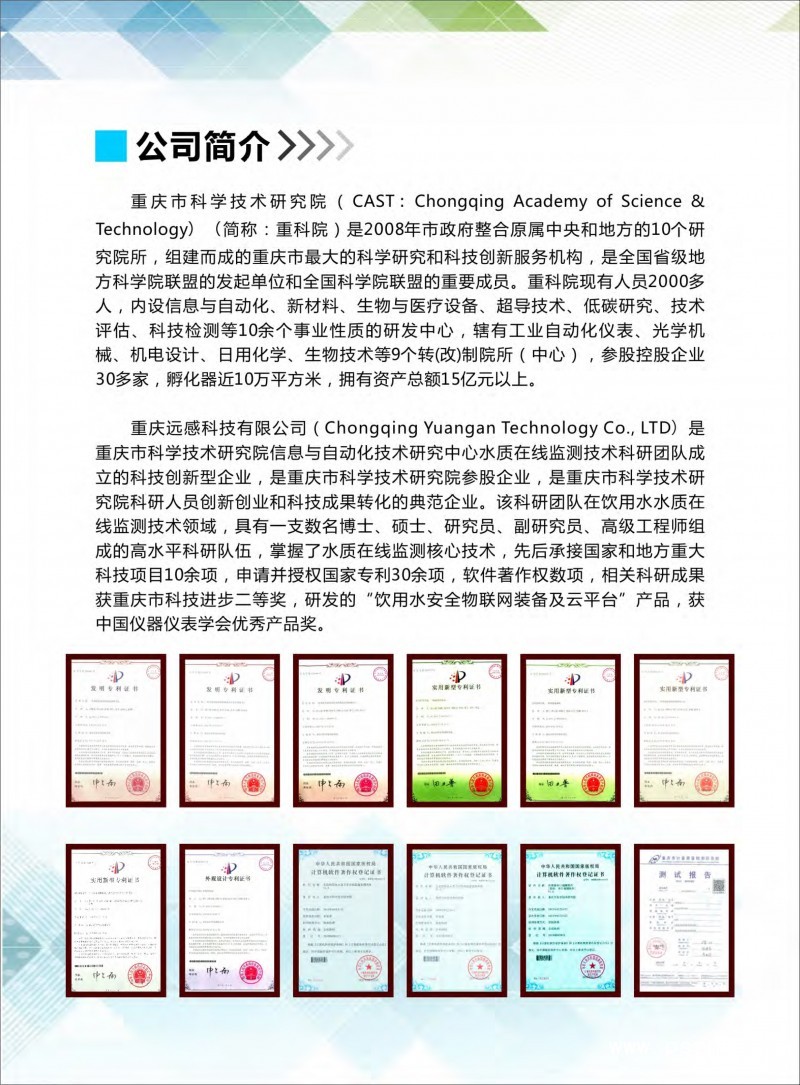 重慶遠(yuǎn)感科技有限公司(Chongqing Yuangan Technology Co., LTD)是重慶市科學(xué)技術(shù)研究院信息與自動(dòng)化技術(shù)研究中心水質(zhì)在線監(jiān)測(cè)技術(shù)科研團(tuán)隊(duì)成立的科技創(chuàng)新型企業(yè),是重慶市科學(xué)技術(shù)研究院參股企業(yè),是重慶市科學(xué)技術(shù)研究院科研人員創(chuàng)新創(chuàng)業(yè)和科技成果轉(zhuǎn)化的典范企業(yè)。該科研團(tuán)隊(duì)在飲用水水質(zhì)在線監(jiān)測(cè)技術(shù)領(lǐng)域,具有一支數(shù)名博士、碩士、研究員、副研究員、高級(jí)工程師組成的高水平科研隊(duì)伍,掌握了水質(zhì)在線監(jiān)測(cè)核心技術(shù),先后承接國(guó)家和地方重大科技項(xiàng)目10余項(xiàng),申請(qǐng)并授權(quán)國(guó)家專利30余項(xiàng),軟件著作權(quán)數(shù)項(xiàng),相關(guān)科研成果獲重慶市科技進(jìn)步二等獎(jiǎng),研發(fā)的“飲用水安全物聯(lián)網(wǎng)裝備及云平臺(tái)”產(chǎn)品,獲中國(guó)儀器儀表學(xué)會(huì)優(yōu)秀產(chǎn)品獎(jiǎng)。
