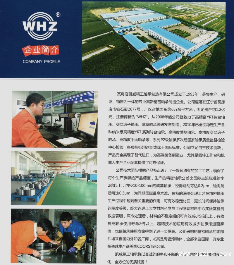 瓦房店凱威精工軸承制造有限公司成立于1993年,是集生產(chǎn),研發(fā),銷售為一體的大型專業(yè)軸承制造企業(yè)。公司座落在遼寧省瓦房店市鉆石街2677號,廠區(qū)占地面積約6萬多平方米,建筑面積約34800平方米(其中辦公樓面積6000多平方米,生產(chǎn)車間25800多平方米),固定資產(chǎn)1億2千萬元,先進(jìn)的機(jī)械設(shè)備426臺,精良的儀器儀表300余臺套,有職工536余人,其中高級工程師43人,注冊商標(biāo)為"WHZ",主要生產(chǎn)"0-9"類精度等級可達(dá)P2級的各種標(biāo)準(zhǔn)、非標(biāo)準(zhǔn)滾動軸承,P2級軸承多次經(jīng)國家軸承質(zhì)量監(jiān)督檢驗(yàn)中心檢驗(yàn),各項(xiàng)指標(biāo)均達(dá)到或優(yōu)于國際標(biāo)準(zhǔn)。主產(chǎn)品為:YRT 轉(zhuǎn)臺軸承、進(jìn)口精密機(jī)床軸承國產(chǎn)替代化產(chǎn)品。精度等級為P2、UP、P4、SP和P5,內(nèi)徑從80-3000mm,并能夠自主設(shè)計(jì)生產(chǎn)標(biāo)準(zhǔn),精度等級完全達(dá)標(biāo)的軸承產(chǎn)品。已先后多年成功的為北京精雕科技有限公司、武漢武重機(jī)床有限公司、沈陽第一機(jī)床廠、安陽機(jī)床廠、齊重?cái)?shù)控裝備股份有限公司、上海重型機(jī)床廠、青海華鼎重型機(jī)床有限責(zé)任公司、等單位實(shí)現(xiàn)了進(jìn)口產(chǎn)品替代化。同時公司積極開拓歐美等國外市場,公司產(chǎn)品已經(jīng)遠(yuǎn)銷到德國、美國、烏克蘭、韓國、臺灣等國家和地區(qū)。