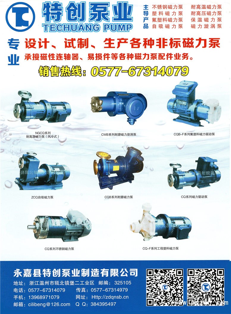 永嘉縣特創(chuàng)泵業(yè)制造有限公司 各種磁力驅(qū)動離心泵(以下簡稱磁力泵)。