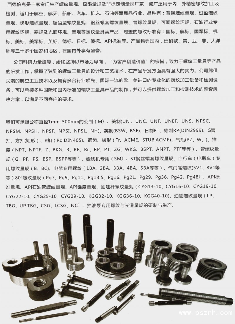 我公司可承接各種公稱直徑“1mm-1000mm”的公制、美制、英制、日制、德制、米制、管制、方扣、R扣、鋸齒、梯形、氣瓶、錐度(NPT、NPTF、Z、R、RC、RP、RB、PT、ZG)、抽油桿、油管(LP、TBG、UPTBG、CSG)、鉆桿、抽油泵專用等螺紋與光滑量規(guī)的研制與生產(chǎn)任務(wù),也可承接各種可調(diào)式量規(guī)與各種汽車用位置度規(guī)、非標(biāo)刃具等。
