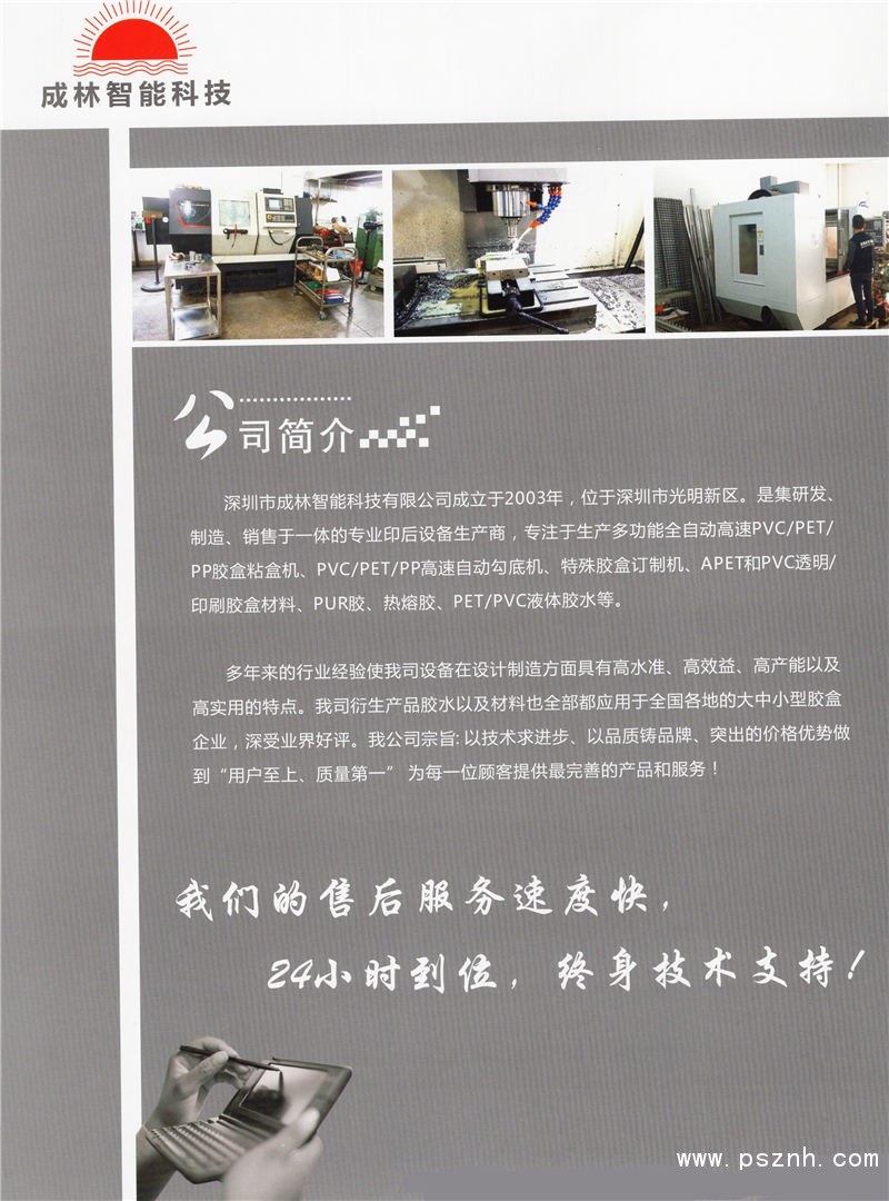 深圳市成林智能科技有限公司成立于2003年,本公司專業(yè)生產(chǎn)多功能自動(dòng)膠盒粘盒機(jī)  、自動(dòng)膠盒勾(扣)底機(jī),多年來,服務(wù)于全國各地的大中小型膠盒企業(yè),深受業(yè)界一致好評(píng)。我公司使命:為客戶創(chuàng)造價(jià)值,公司愿景:做一流專業(yè)和服務(wù)的膠盒包裝機(jī)械廠家;公司價(jià)值觀:愛心、創(chuàng)新、奉獻(xiàn)。