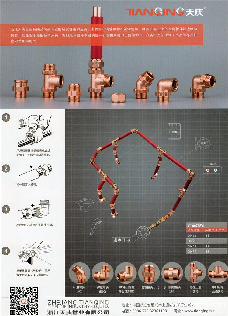 浙江天慶管業(yè)有限公司是專業(yè)的金屬管道制造商,目前主要生產(chǎn)銅管件和不銹鋼管件。公司專業(yè)生產(chǎn)6到325毫米銅管件和12.7到152.4毫米不銹鋼管件。 公司目前擁有一流的彎管設(shè)備和擠壓設(shè)備,彎管設(shè)備主要從澳洲進口,由日本YAMASUI和澳洲PONGRASS公司制造。最大彎曲直徑達到13英寸 (325毫米)。公司還擁有不銹鋼內(nèi)外表面自動拋光設(shè)備,拋光質(zhì)量穩(wěn)定,可靠,且成本大幅降低,開創(chuàng)了國內(nèi)機器自動拋光的先河,為拓展國內(nèi)外市場奠定了良好的基礎(chǔ)。 公司目前擁有員工近50人,各種加工設(shè)備100多臺,年生產(chǎn)能力銅管件500噸,不銹鋼管件300噸。公司產(chǎn)品主要應用于給水管道,空調(diào),制冷,食品,醫(yī)藥等行業(yè)。產(chǎn)品主要出口到美國,加拿大,澳大利亞,中東,東南亞等國家,以及國內(nèi)市場。公 司坐落于中國浙江紹興市上虞區(qū),到上海港和寧波港路程基本一樣,交通發(fā)達,希望國內(nèi)外客戶蒞臨天慶參觀和指導。 我們將竭誠為客戶提供質(zhì)量上乘,價格合理的產(chǎn)品。