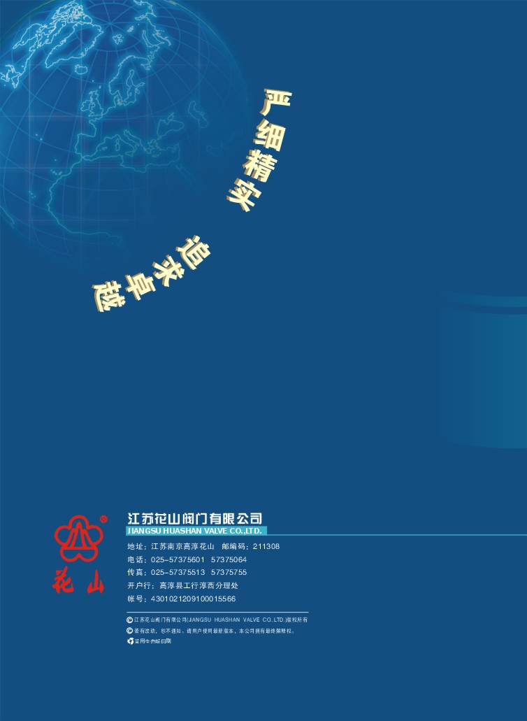 江蘇花山閥門有限公司原位于南京市高淳固城湖畔,隸屬于花山集團(tuán),于2009年搬遷到溧水經(jīng)濟(jì)開發(fā)區(qū),占100畝,擁有員工600余人,是中國閥門協(xié)會(huì)會(huì)員單位,“花山”牌閥門1998-2006年度被江蘇省名牌戰(zhàn)略推進(jìn)委員會(huì)授予“江蘇名牌產(chǎn)品”稱號(hào),2003年獲“江蘇省著名商標(biāo)”稱號(hào),2004年被評(píng)為“江蘇省質(zhì)量信用產(chǎn)品”,通過ISO90001-2000質(zhì)量體系認(rèn)證,主要生產(chǎn)灰鐵、可鍛鑄件、碳鋼、不銹鋼、銅合金各種材質(zhì)閥門,形成年產(chǎn)5000余噸閥門的生產(chǎn)能力,公司堅(jiān)持嚴(yán)精細(xì)實(shí)的企業(yè)宗旨,不斷提高產(chǎn)品核心競爭力。展望未來,花山人將以科學(xué)的發(fā)展觀為指導(dǎo),以嚴(yán)格的質(zhì)量管理為基石,完善現(xiàn)代企業(yè)制度,全面提高產(chǎn)品檔次和質(zhì)量水平,提供顧客滿意的產(chǎn)品和服務(wù)。