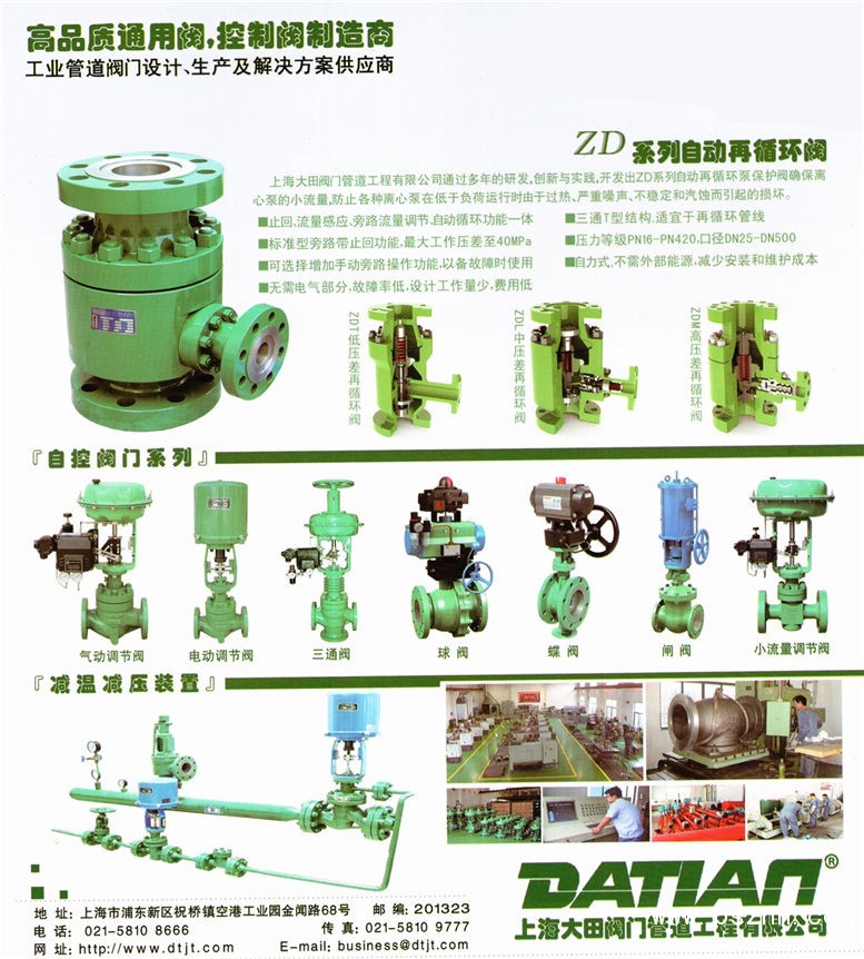 公司現(xiàn)在生產(chǎn)的產(chǎn)品有調(diào)節(jié)閥及附件、通用閥門、減溫減壓裝置、自動(dòng)再循環(huán)控制閥、電磁閥、API6A閥門等。調(diào)節(jié)閥及附件包含有:氣動(dòng)調(diào)節(jié)閥、 電動(dòng)調(diào)節(jié)閥、自力式調(diào)節(jié)閥、手動(dòng)調(diào)節(jié)閥、氣動(dòng)薄膜執(zhí)行機(jī)構(gòu)、電動(dòng)執(zhí)行機(jī)構(gòu)、電氣閥門定位器、電動(dòng)閥門調(diào)節(jié)模塊等。通用閥門包含有:閘閥、截止閥、球閥、蝶閥、止回閥、水力控制閥、柱塞閥、旋塞閥、隔膜閥、安全閥、減壓閥、疏水閥、排氣閥、平衡閥、針型閥及多種襯里閥門等。減溫減壓裝置分為低壓、中壓、次高壓、高壓四種規(guī)格。自動(dòng)再循環(huán)控制閥分為低壓、中壓、高壓三種規(guī)格。電磁閥包含有:水用電磁閥、蒸汽電磁閥、煤氣電磁閥、空氣電磁閥、真空電磁閥、高溫電磁閥等。API6A閥門包含有閘閥、節(jié)流閥等。同時(shí),公司可按照客戶的要求進(jìn)行非標(biāo)產(chǎn)品的設(shè)計(jì)、制造、加工。