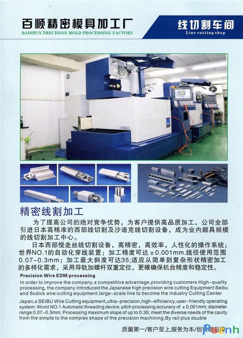 車間設備:Sodick日本沙迪克慢走絲(AG、AQ、AD系列)4臺,日本西部高精密慢走絲(可加工0.05mm線精度0.002mm),臺灣福裕精密大水磨一臺(平面度厚度精度0.002mm),建得大水磨二臺,精密小磨床多臺( 精度0.002mm),銑床等。