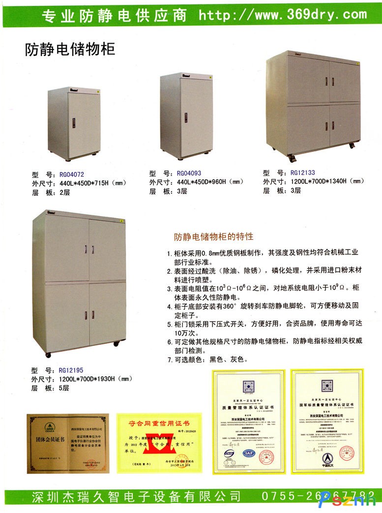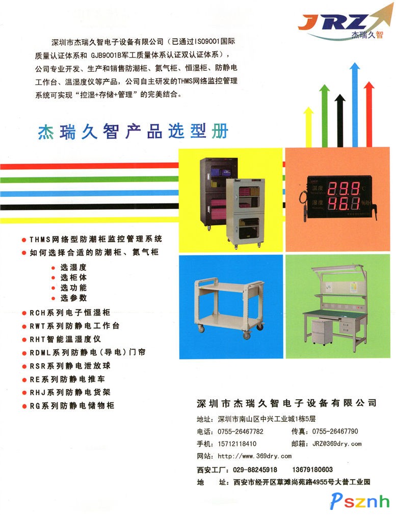 深圳市杰瑞久智電子設(shè)備有限公司是一家通過ISO9001-2008質(zhì)量體系認證和GJB9001-2009國軍標質(zhì)量體系認證的雙認證企業(yè)。公司現(xiàn)為中國電子協(xié)會防靜電分會的會員單位。它集研發(fā)、生產(chǎn)、貿(mào)易為一體,專業(yè)開發(fā)、生產(chǎn)和銷售防潮柜氮氣柜及防靜電產(chǎn)品的公司,同時為電子生產(chǎn)研究企業(yè)提供完善配套的電裝工具和防靜電凈化產(chǎn)品是以開發(fā)、研制、銷售環(huán)境控制電子設(shè)備及其附屬產(chǎn)品、儀器、儀表等產(chǎn)品的專業(yè)化公司。公司依托國內(nèi)高等院校較強的研究能力和開發(fā)技術(shù)能力,與其聯(lián)合探索,研究開發(fā)出了國內(nèi)領(lǐng)先、國際先進的工業(yè)級電子防潮柜,氮氣柜,恒濕柜,溫濕度顯示儀以及網(wǎng)絡(luò)型監(jiān)控管理系統(tǒng)。全球首創(chuàng)網(wǎng)絡(luò)防潮柜的概念。防靜電方面公司的產(chǎn)品有:防靜電工作臺 推車 儲物柜 貨架 門簾和靜電泄放球。還有公司的HS直流電烙鐵是中國航空工業(yè)的首選產(chǎn)品。同時公司經(jīng)營知名品牌的除濕機、加濕機、保溫箱、恒溫恒濕箱等環(huán)境控制產(chǎn)品和設(shè)備。